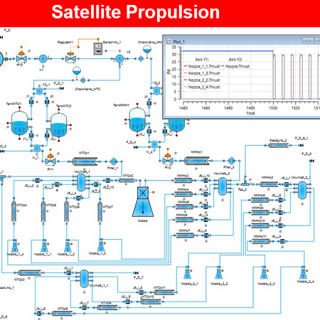THRUST는 FLUIDAPRO 툴킷의 확장 모듈로서, 항공우주 추진 시스템의 모델링 및 시뮬레이션 기능을 추가하는 역할을 합니다. 이 툴킷은 체적 요소(볼륨), 열교환기, 화학 반응기, 탱크, 펌프, 압축기, 터빈, 배관, 밸브, 액추에이터 등 다양한 구성 요소를 통해 유체 시스템을 시뮬레이션할 수 있는 기능을 제공합니다.